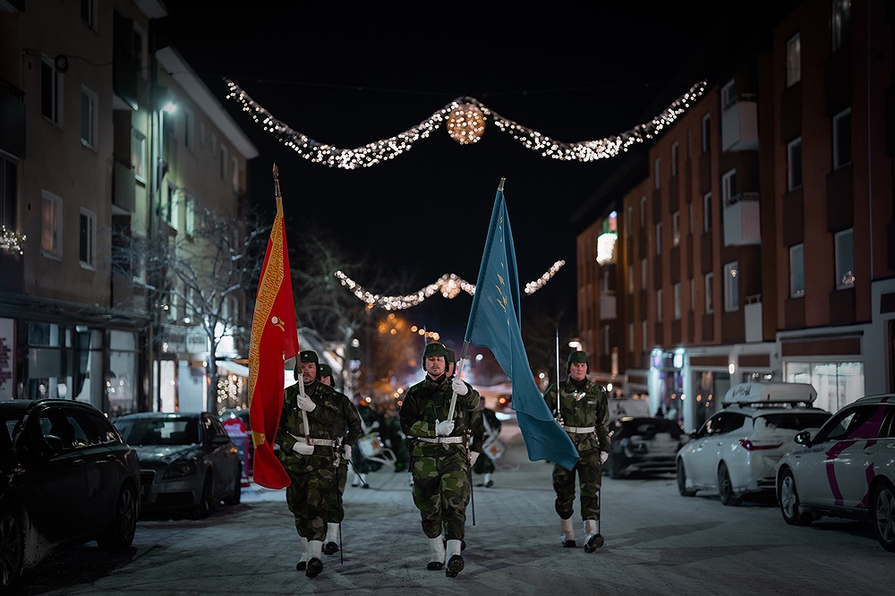 Trumslagare ur Uppsala hemvärnsmusikkår i täten för fackeltåget. Foto: Försvarsmakten Cecilia Tollefeldt